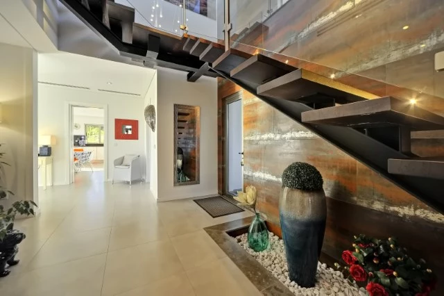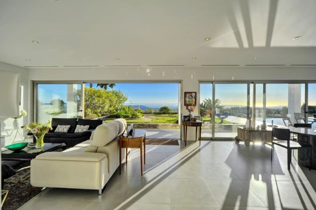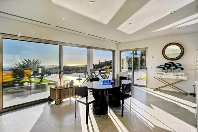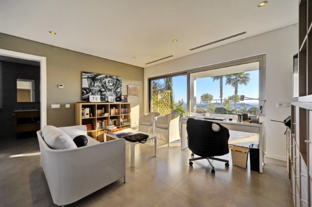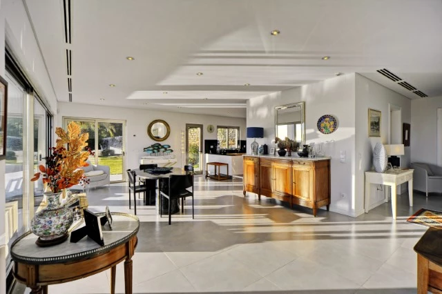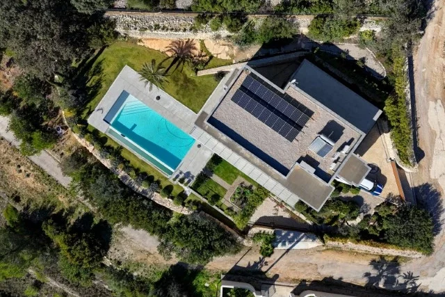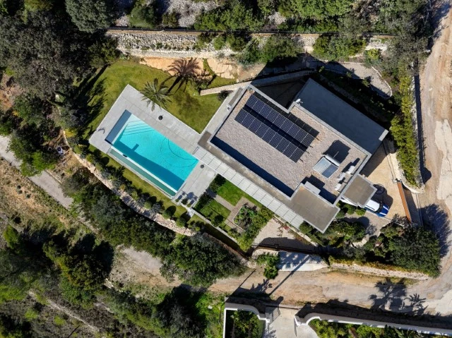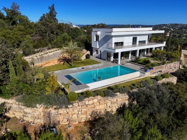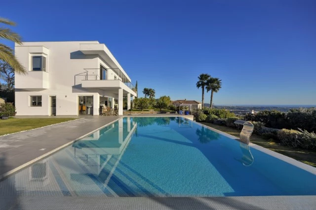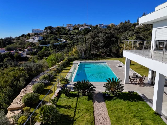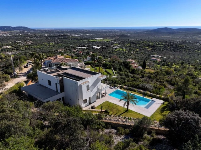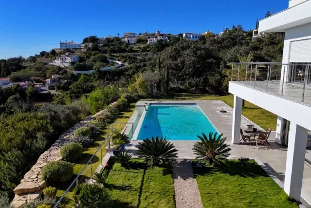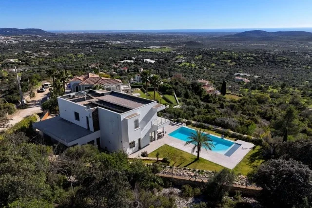 SOLE AGENT – Built in 2021, contemporary 5-bedroom villa in a dominant position with swimming pool on 4,000 m2 with breathtaking views of the ocean. Certified A+, optimal level of comfort: insulation, underfloor heating, integrated reversible air conditioning, 18 photovoltaic panels, borehole. The 76 m2 open plan living and kitchen area opens directly onto the terraces, the garden and the heated infinity pool (12 x 5.5 m) facing south and offers an ‘in – out’ way of life perfectly suited to the mild climate of the Algarve. An en-suite bedroom on the ground floor, a laundry room and a guest toilet. 4 bedrooms upstairs with fitted wardrobes and dressing rooms. Two-car garage, workshop and carport. The garden with olive, lemon and orange trees, bougaivilliers, yuccas, oak, sicas… In absolute calm, only 5 minutes drive from the centre of Loulé, 25 minutes from the airport.