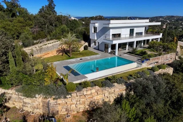 The interior features an open-plan concept, with the living and dining areas flowing seamlessly into the kitchen, creating a welcoming and functional space. All social areas have direct access to the outdoors, enhancing the connection between indoor living and the surrounding garden.